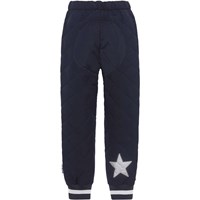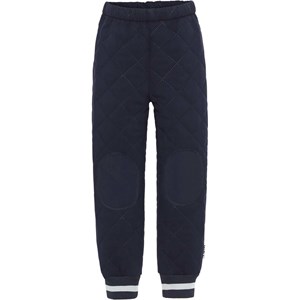 Hoti is een licht geïsoleerde thermobroek in donkerblauw met een contrasterende binnenkleur in mosgroen. De broek heeft elastiek rond de taille, ribboord rond de enkels en Molo's iconische reflector op de achterkant van een pijp zodat het kind in het donker beter zichtbaar is. De broek heeft ook bijpassende verstevigingen op de knieën en het zitvlak, wat de broek duurzaam maakt voor allerlei activiteiten en spel.