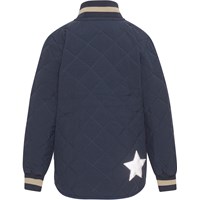 Husky is een donkerblauwe licht geïsoleerde thermische jas. De jas heeft een ribboord aan de hals en mouwen en heeft Molo's iconische sterreflector op de achterkant voor betere zichtbaarheid in het donker.