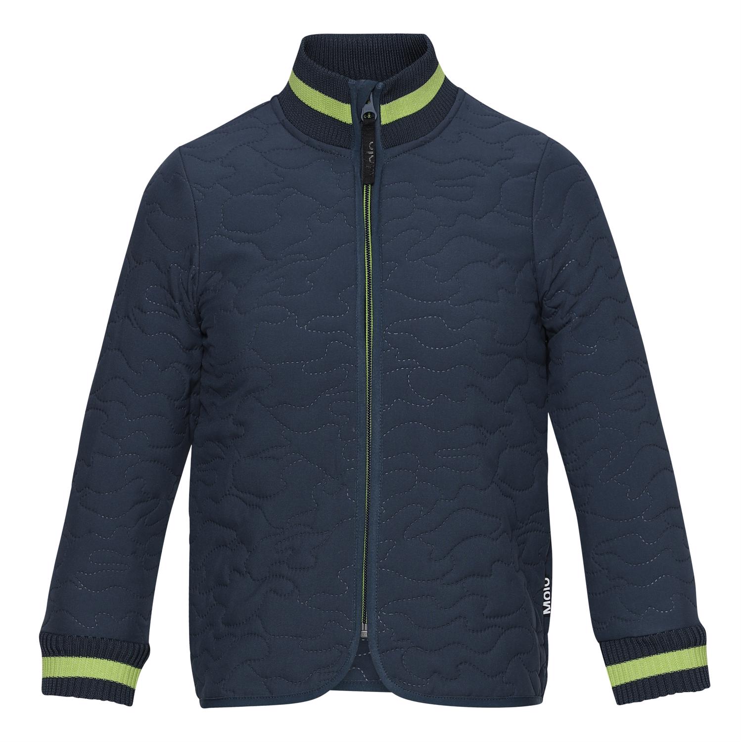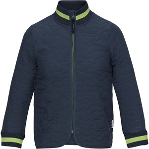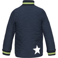 Husky is een thermo jas in donkerblauw met een prachtig steekpatroon. Het heeft een groene ritssluiting en groen gestreepte ribboord bij de kraag en mouwen.