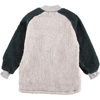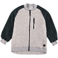 Uberto is een lichtgrijze teddy fleece jas met donkergrijze mouwen en een ritssluiting aan de voorkant. Uberto heeft grijze ribboorden bij de hals, mouwen en onderkant. Het heeft een zak met ritssluiting aan de voorzijde. Molo's fleece jassen zijn geïsoleerd en warm. Gebruik het alleen of als extra laag onder een jas op een zeer koude dag.