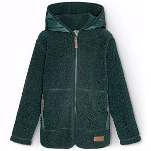 Groene fleecejas met een rits en grote zakken aan de voorkant en een capuchon. De fleecejas is goed geïsoleerd en kan daarom op zichzelf gedragen worden of als extra laag onder buitenkleding op de koudste dagen.