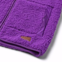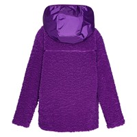 Paarse fleecejas met een rits en grote zakken aan de voorkant en een capuchon. De fleecejas is goed geïsoleerd en kan daarom op zichzelf gedragen worden of als extra laag onder buitenkleding op de koudste dagen.