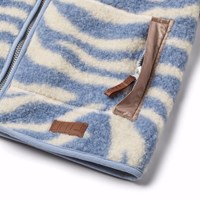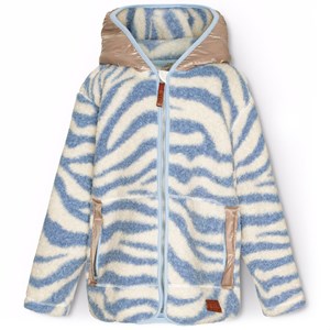 Lavendelblauwe zebra gestreepte fleecejas met een rits en grote zakken aan de voorkant en een zachtroze capuchon. De fleecejas is goed geïsoleerd en kan daarom op zichzelf gedragen worden of als extra laag onder buitenkleding op de koudste dagen.