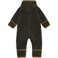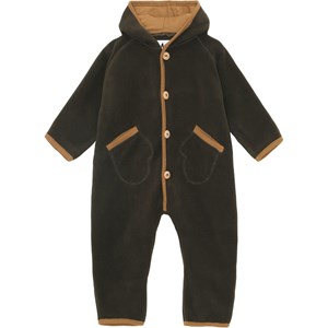 Udo is een baby fleecepak in een donkerbruine kleur met lichtbruine boorden en wantvormige zakken. De romper heeft een knoopsluiting aan de voorkant en een capuchon. Molo's fleecepakjes zijn warm en isolerend. Draag het alleen of, op zeer koude dagen, als extra laag onder een skipak. Dit model heeft slofjes voor de maten 56-74. Maten 80-92 hebben geen slofjes.