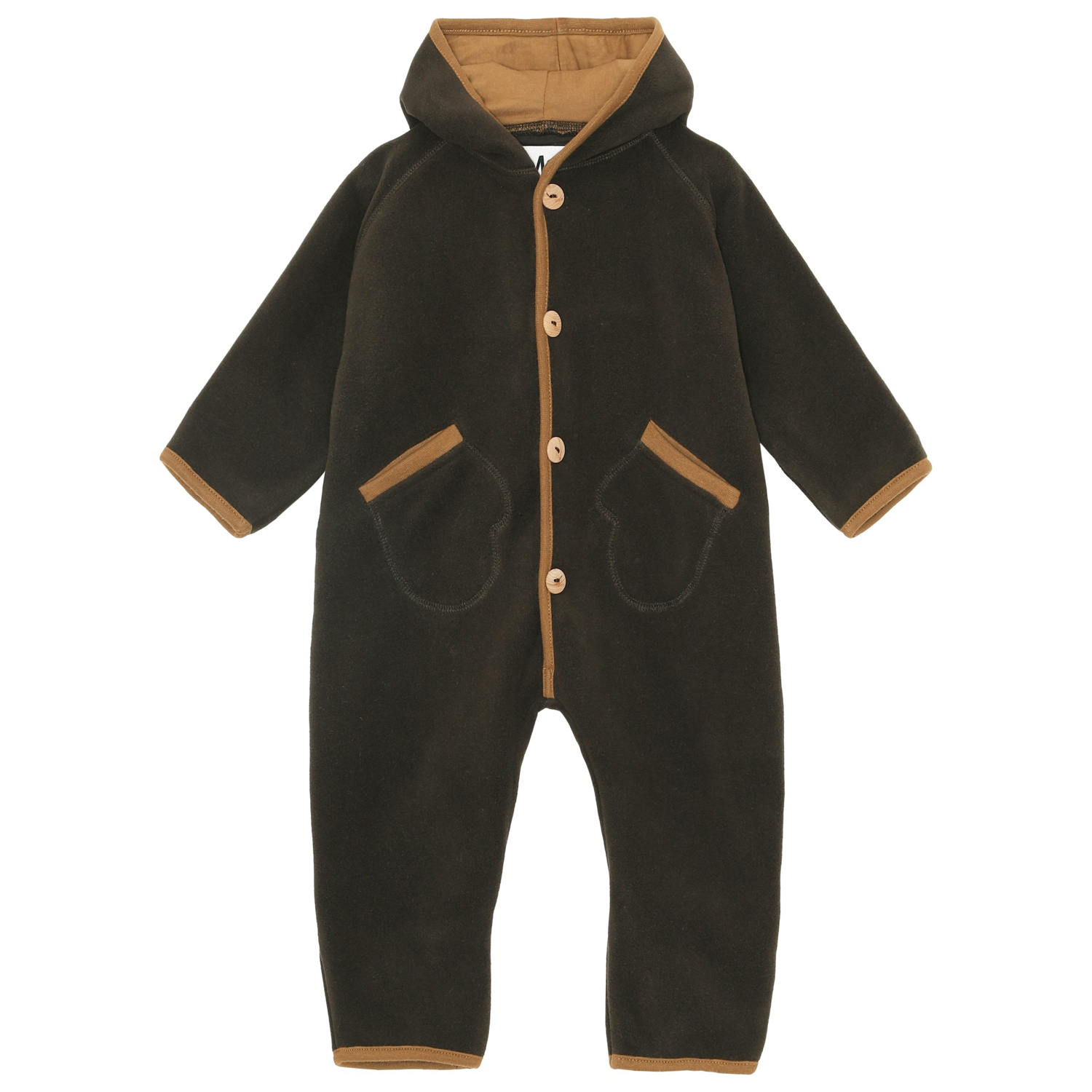 Udo is een baby fleecepak in een donkerbruine kleur met lichtbruine boorden en wantvormige zakken. De romper heeft een knoopsluiting aan de voorkant en een capuchon. Molo's fleecepakjes zijn warm en isolerend. Draag het alleen of, op zeer koude dagen, als extra laag onder een skipak. Dit model heeft slofjes voor de maten 56-74. Maten 80-92 hebben geen slofjes.