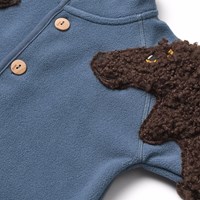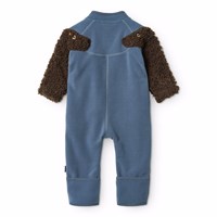 Blauw fleecepak voor de kleintjes gemaakt van gerecycled polyester met knoopsluiting aan de voorkant en schattige, bruine hondenmouwen. Het pak is zacht, heeft een normale pasvorm en werkt zowel op zichzelf als als extra laag onder een skipak.