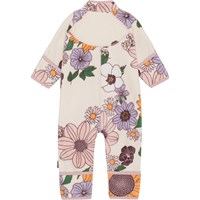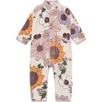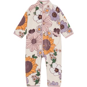 Bloemrijke fleecedragen met roze randen, handschoenvormige zakken en handige knoopsluiting aan de voorkant. De fleecedragen houdt warmte vast en werkt isolerend, waardoor deze alleen gedragen kan worden of als extra laag onder de overall op de koudste dagen. Dit model wordt geleverd met voetjes van maat 56-74 en zonder voetjes van maat 80-92.