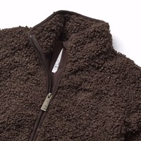 Donkerbruine fleecejas gemaakt van gerecycled polyester met op de achterkant een mooie patch in duurzaam nylon. De jas heeft een gladde katoenen voering, bruine ribboorden, een hoge kraag, een ritssluiting aan de voorkant en een duimgat.