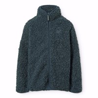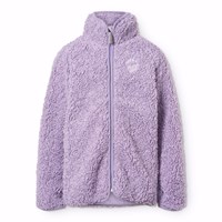 Paarse fleecejas van gerecycled polyester met op de achterkant een mooie patch van duurzaam nylon. De jas heeft een gladde katoenen voering, paarse ribboorden, een hoge kraag, een ritssluiting en een duimgat.