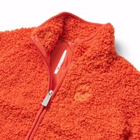 Oranje fleecejas van gerecycled polyester met op de achterkant een mooie patch van duurzaam nylon. De jas heeft een gladde katoenen voering, oranje ribboorden, een hoge kraag, een ritssluiting en een duimgat.