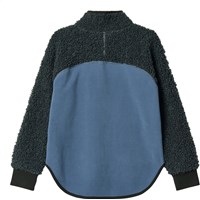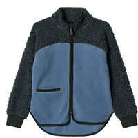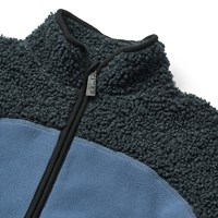 Blauwe fleecejas gemaakt van gerecycled polyester met bijpassende ribboorden en details in zacht teddymateriaal. De jas heeft een hoge kraag, een ritssluiting, een voorzak en een is verlengd aan de achterkant. Het is zacht, heeft een normale pasvorm en werkt zowel op zichzelf als als extra laag onder een jas.