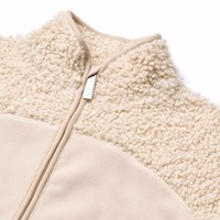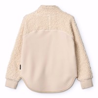 Gebroken witte fleecejas gemaakt van gerecycled polyester met bijpassende ribboorden en details in zacht teddymateriaal. De jas heeft een hoge kraag, een ritssluiting, een voorzak en een is verlengd aan de achterkant. Het is zacht, heeft een normale pasvorm en werkt zowel op zichzelf als als extra laag onder een jas.