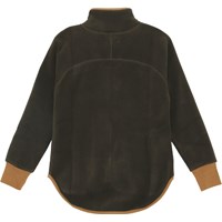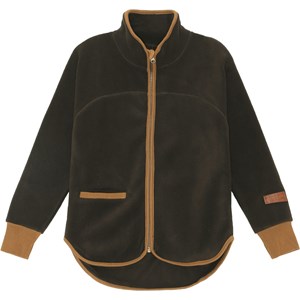Ulani is Molo's nieuwe fleecejack in donkerbruin met lichtbruine boorden. De jas heeft een ritssluiting, ribboord rond de mouwen en is aan de achterkant iets langer.