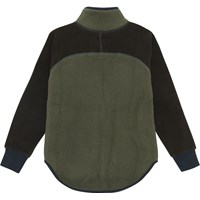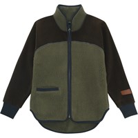 Ulani is Molo's nieuwe fleecejack in groen met de mouwen en de bovenkant van het jasje in het bruin. De jas heeft een ritssluiting, ribboord rond de mouwen en is aan de achterkant iets langer.