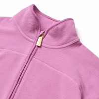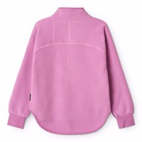 Roze fleecejas gemaakt van gerecycled polyester met bijpassende ribboorden. De jas heeft een hoge kraag, een rits aan de voorkant, een voorzak en een verlengde achterkant. Het is zacht, heeft een normale pasvorm en werkt zowel op zichzelf als als extra laag onder een jas.