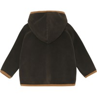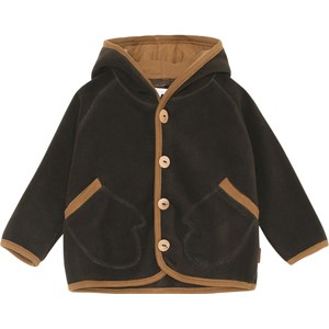 Uli is een donkerbruine baby fleece jas met capuchon en lichtbruine boord. De jas heeft wantvormige voorzakken en een knoopsluiting aan de voorkant.
