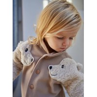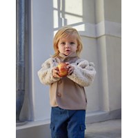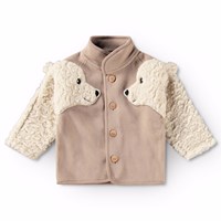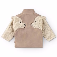 Beige en gebroken witte fleece jas voor baby's en peuters. De jas heeft een knoopsluiting aan de voorkant en schattige mouwen met ijsberen. De fleece jas is geïsoleerd en kan daarom alleen gedragen worden of op de koude dagen als extra laag onder buitenkleding.