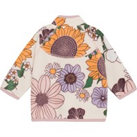 Gebloemd fleecejasje voor peuters met roze randen, zakken in de vorm van handschoenen en een praktische knoopsluiting aan de voorkant.