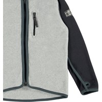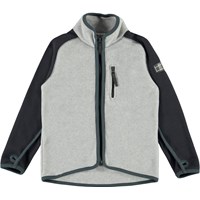 Ulrick is een grijze fleece jack met zwarte mouwen en groene randen. Het heeft een ritssluiting en een borstzak. De fleece jack van Molo is warm en houd je geïsoleerd. Draag hem alleen of, op erg koude dagen, als extra laag onder een andere jas.