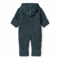 Donkerblauw fleecepak voor de kleintjes gemaakt van gerecycled polyester met zachte katoenen voering. Het pak heeft een ritssluiting, een capuchon met vastgenaaide kleine teddybeeroortjes, bijpassende ribboorden en kan alleen gedragen worden of als extra laag onder het skipak.