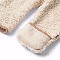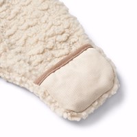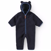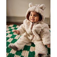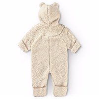 Gebroken witte fleecepak voor baby's en peuters. Het fleecepak heeft een rits, een capuchon met vastgenaaide kleine teddyberen oren en beige randen. Het fleece pak is geïsoleerd en kan daarom op zichzelf worden gedragen of op koude dagen als extra laag onder het skipak. Dit model wordt geleverd met slofjes voor maten 56-74 en zonder slofjes voor maten 80-92.