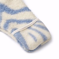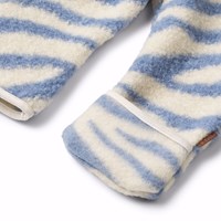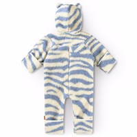 Lavendelblauwe zebragestreepte fleecepak voor baby's en peuters. Het fleecepak heeft een rits, een capuchon met vastgenaaide kleine teddyberen oren en beige randen. Het fleece pak is geïsoleerd en kan daarom op zichzelf worden gedragen of op koude dagen als extra laag onder het skipak. Dit model wordt geleverd met slofjes voor maten 56-74 en zonder slofjes voor maten 80-92.
