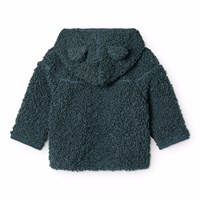 Donkerblauwe fleecejas voor de kleintjes gemaakt van gerecycled polyester met zachte katoenen voering. De jas heeft een ritssluiting, een capuchon met opgenaaide kleine teddybeeroortjes en bijpassende boorden. Het is zacht, heeft een normale pasvorm en werkt zowel op zichzelf als als extra laag onder een jas.