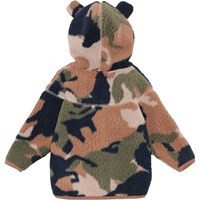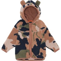 Ummi is een zacht baby fleece jas in lichtroze met camouflage print. Ummi heeft een capuchon met kleine opgenaaide oren en ribboord aan de rand van de capuchon, mouwen en onderkant. Je kunt het als laagje dragen of alleen omdat het warm en isolerend is.