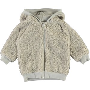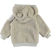 Ummi is een zachte baby fleecejas in gebroken wit. Ummi heeft een capuchon met opgenaaide oren en ribboord rond de rand van de capuchon, mouwen en onderkant. Je kunt het dragen als laagje of alleen omdat het warm en isolerend is.