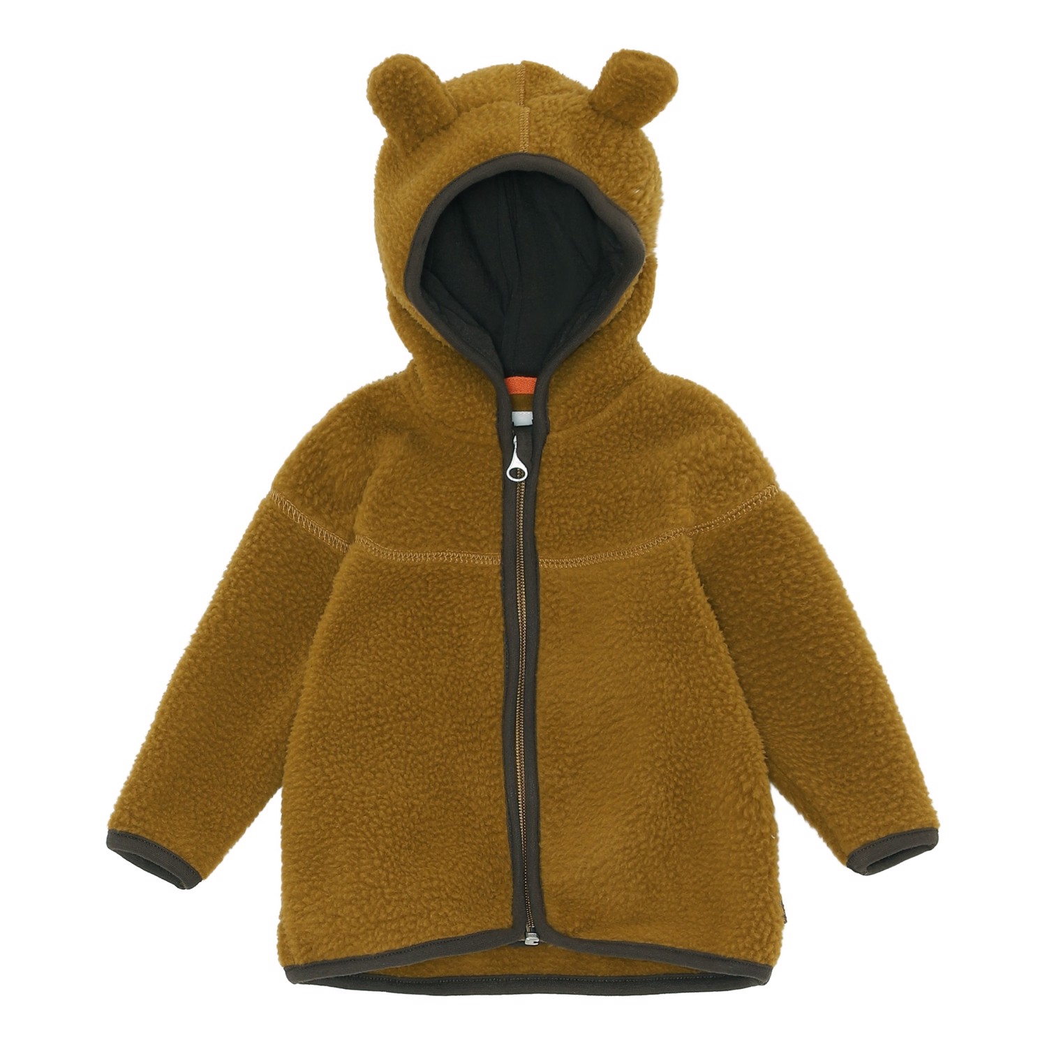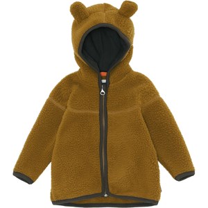 Ummi is een zacht baby fleece jas in bruin met camouflage print. Ummi heeft een capuchon met kleine opgenaaide oren en ribboord aan de rand van de capuchon, mouwen en onderkant. Je kunt het als laagje dragen of alleen omdat het warm en isolerend is.