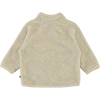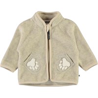Uni is een babyjasje in lichtgele polar fleece met grijze randen en stiksels. Het jasje heeft mooie gebreide voorzakken die eruit zien als kleine wanten met een berenpoot print. Draag het fleece jasje alleen of, op zeer koude dagen, als extra laag onder een ander jas.