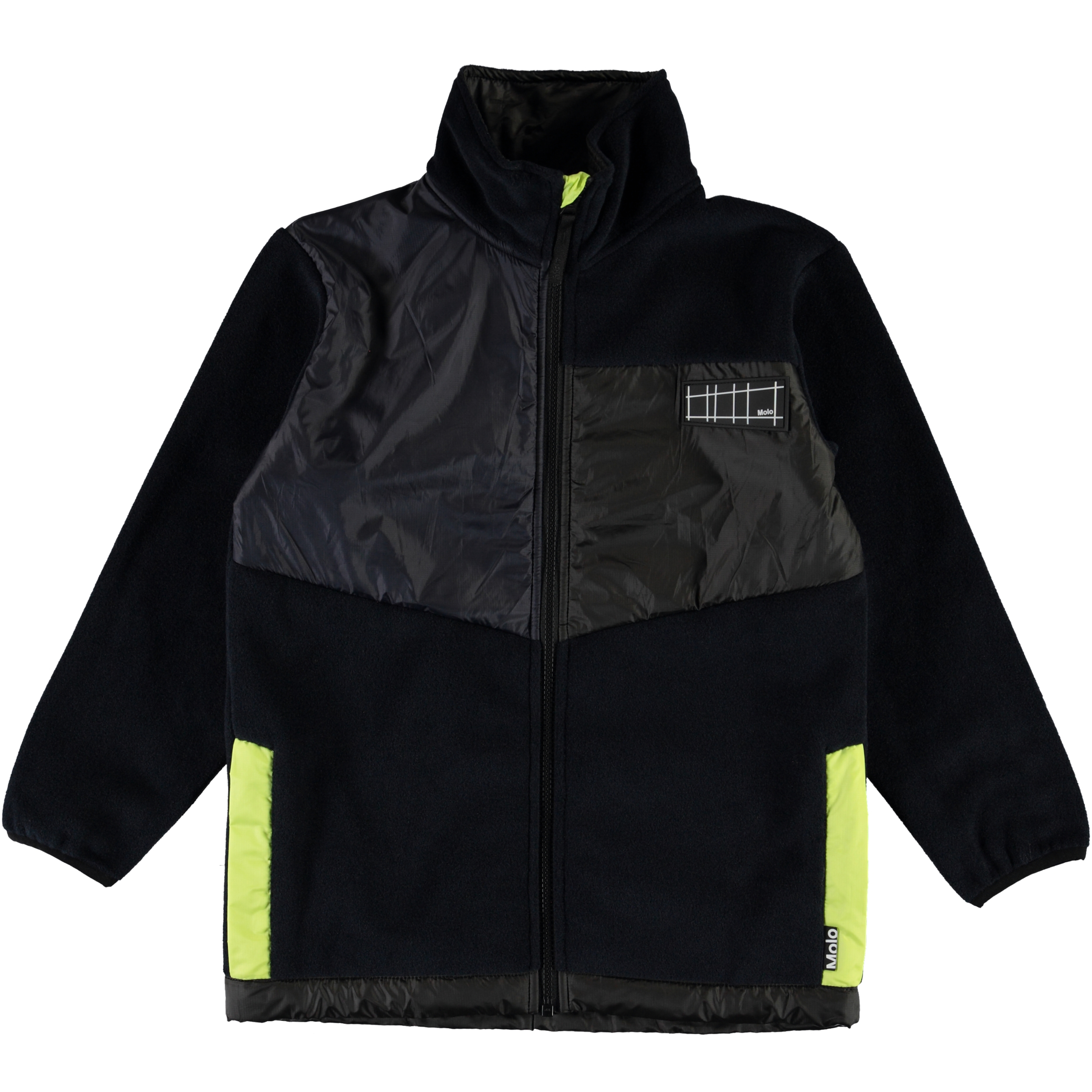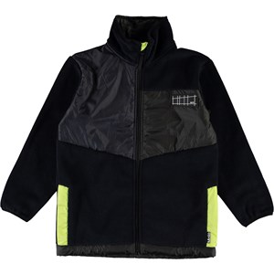 Urbain is Molo's coole nieuwe fleecejas in donkerblauw met neon groene details en panelen met een glanzend oppervlak aan de voor- en achterkant. De jas heeft een ritssluiting en ritszakken. Draag de jas met de bijpassende fleece broek.
