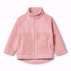 Roze fleecejas van gerecycled polyester met zakken aan de voorkant en duurzame details. De jas heeft een ruimvallende pasvorm, hoge kraag, ritssluiting met kinbescherming en is langer aan de achterkant.