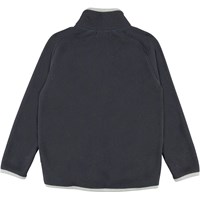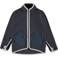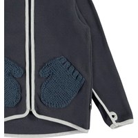 Ushi is een blauwe jack van polar fleece met een hoge kraag, een ritssluiting aan de voorkant en duimgaten. Het heeft mooie gebreide voorzakken die eruit zien als kleine wanten. Draag hem alleen of, op erg koude dagen, als extra laag onder een andere jas.