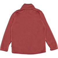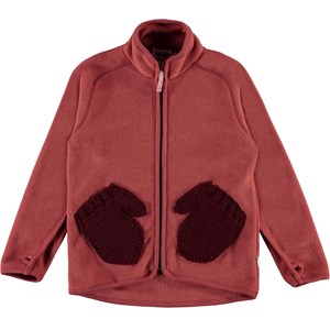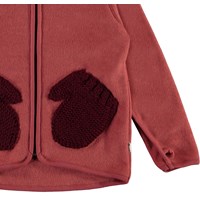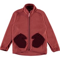 Ushi is een rode jack van polar fleece met een hoge kraag, een ritssluiting aan de voorkant en duimgaten. Het heeft mooie gebreide voorzakken die eruit zien als kleine wanten. Draag hem alleen of, op erg koude dagen, als extra laag onder een andere jas.