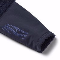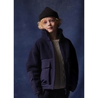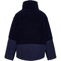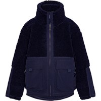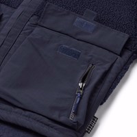 Donkerblauwe fleecejas met grote externe voorzakken. De jas heeft een hoge kraag en een rits aan de voorkant.