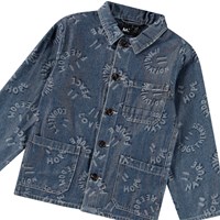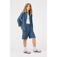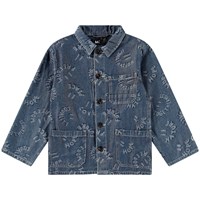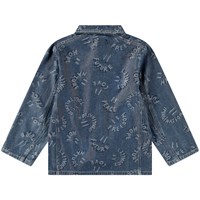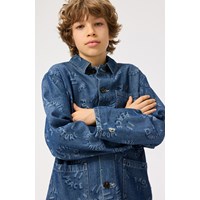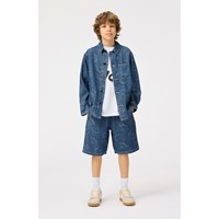 Blauwe spijkerjas van zacht katoen met een geweven prachtig jacquardpatroonvan smile's met positieve woorden als mond. De jas heeft een ruimvallende pasvorm, normale kraag, knoopsluiting aan de voorkant en drie opgestikte zakken aan de voorkant. Combineer de jas met bijpassende shorts of broek voor een complete set.