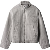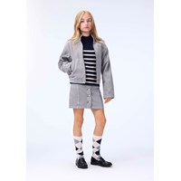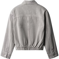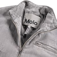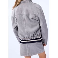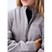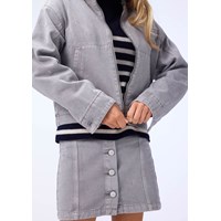 Grijze spijkerjas met geborduurde sterren in zilverdraad. De jas heeft een opstaande kraag, een rits aan de voorkant, opgestikte zakken aan de voorkant, een borstzak met een rits en mouwen met knoopsluiting. De jas heeft een normale pasvorm en elastiek aan de achterkant, wat zorgt voor een getailleerde pasvorm rond de heupen. Draag de jas zowel buiten als binnen en combineer het met een bijpassende rok.