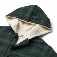 Groen geruite overshirt gemaakt van zacht biologisch katoen. Het overshirt heeft een ruimvallende pasvorm, een gevoerde capuchon, knoopsluiting en lange mouwen met manchetten en knoopsluiting. Het overshirt is gevoerd met een lichte zachte teddyvoering, waardoor het comfortabel is om te dragen en ideaal voor overgangsperiodes of als extra laag op koelere dagen.