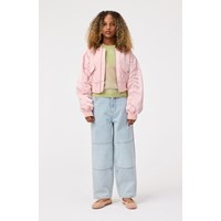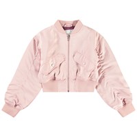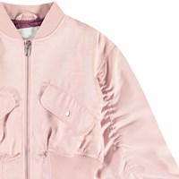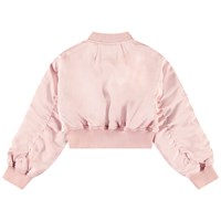 Cropped bomberjack in roze met een paarse voering. De jas heeft een ritssluiting, voorzakken met klepzakken en ribboorden rond de hals, polsen en zoom.