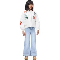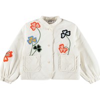 Witte gewatteerde jas gemaakt van zachte katoen met gewatteerde voering en kleurrijke bloemen- en vlinderborduursels. De jas heeft een ronde hals, drukknoopsluiting aan de voorkant, elastiek bij de mouwen en twee opgestikte zakken. Een warme en decoratieve jas met een speelse uitstraling – perfect voor overgangsweer.