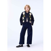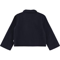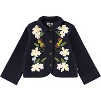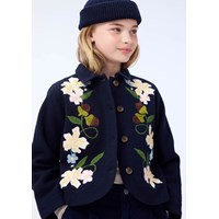 Donkerblauwe wollen jas met elegante borduursels aan de voorkant. De jas heeft een klassieke kraag, knoopsluiting en een heuplengte die hem geschikt maakt voor zowel binnen- als buitengebruik.