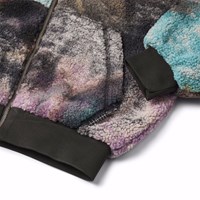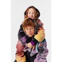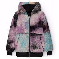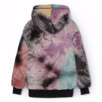 Gekleurde tie-dye jas van zacht imitiatiebont met een rits aan de voorkant. De jas is oversized met een lange schouderzoom, zodat de mouw over de schouder valt. Het heeft zakken aan de voorkant en zwarte geribbelde manchetten aan de mouwen en onderkant. Daarnaast heeft de jas een gladde zwarte katoenen voering, waardoor het comfortabel is om te dragen. Let op dat al onze tie-dye met de hand zijn gemaakt, waardoor een uniek patroon ontstaat dat varieert van stijl tot stijl.
