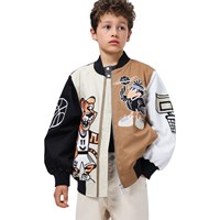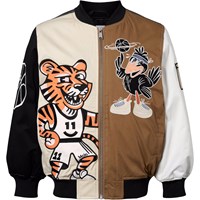 Beige, zwarte en bruine bomberjack met geborduurde motieven van een basketbal, een tijger en een kraai. UNITY-logo op de achterkant, geribbelde randen en zijzakken. Perfect als een licht jack in overgangsperiodes.