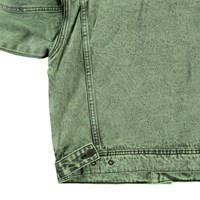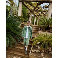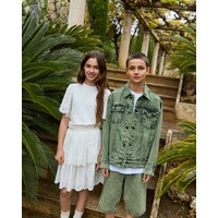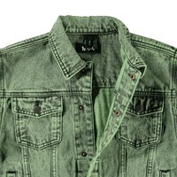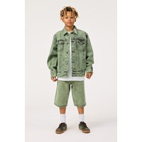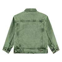 Groene spijkerjas in gewassen katoenlook. De jas heeft een ruimvallende pasvorm, overhemdkraag, knoopsluiting aan de voorkant, steekzakken, borstzakken en verstelbare drukknopen aan de achterkant. Maten 92 t/m 134 hebben drukknopen, waardoor kinderen de jas makkelijker zelf kunnen aantrekken. Maten 140-176 hebben een normale knoopsluiting.