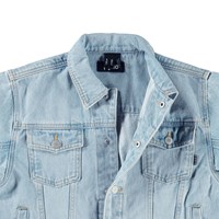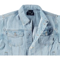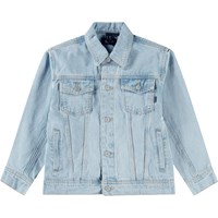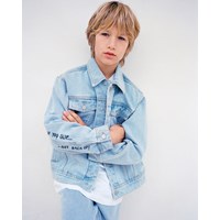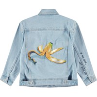Lictblauwe spijkerjas voor kinderen van katoen met op de achterkant een geborduurde bananenschil en op de mouw de tekst 'If you slip...Get back up'.. De jas heeft een ruimvallende pasvorm, overhemdkraag, knoopsluiting aan de voorkant, steekzakken, borstzakken en verstelbare drukknopen aan de achterkant. Maten 92 t/m 134 hebben drukknopen, waardoor kinderen de jas makkelijker zelf kunnen aantrekken. Maten 140-176 hebben een normale knoopsluiting.