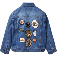 Blauw denim jack gemaakt van katoen met kleurrijke geborduurde patches op de achterkant, wat een unieke en persoonlijke uitstraling geeft. Het jack heeft een losse pasvorm, een overhemdkraag, knoopsluiting aan de voorkant, zijzakken, borstzakken en verstelbare drukknoopsluitingen aan de achterkant. Vanaf maat 92-134 wordt het jack geleverd met drukknoopsluitingen, waardoor het voor kinderen gemakkelijker is om het jack zelf te sluiten. Vanaf maat 140-176 wordt het jack geleverd met een gewone knoopsluiting.