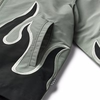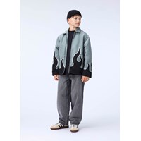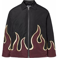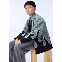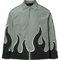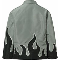 Grijze jas met zwarte vlammen gemaakt van glanzend polyester. De jas heeft een klassieke kraag, een rits aan de voorkant, zijzakken en een ruimvallende pasvorm.