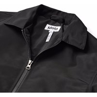 Zwarte jas met bordeauxrode vlammen gemaakt van glanzend polyester. De jas heeft een klassieke kraag, een ritssluiting aan de voorkant, zijzakken en een ruimvallende pasvorm.