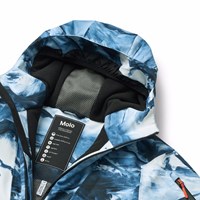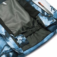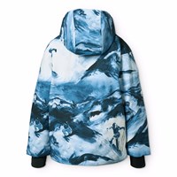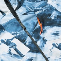 Wind- en waterdichte winterjas gemaakt van gerecycled polyester met een artistieke print van de Alpen en snowboarders in blauwe en witte tinten. De jas heeft een gevoerde capuchon, waterdichte ritsen, een zak op de mouw voor een skipas en een binnenzak voor extra opslag. De jas heeft een windflap rond de taille, klittenband rond de polsen en mouwopeningen met duimgaten, waardoor sneeuw, wind en water buiten blijven. Daarnaast is de jas gevoerd met fleece en met 3M™ Thinsulate™ en heeft het een reflecterende tekst om de zichtbaarheid in het verkeer te vergroten.